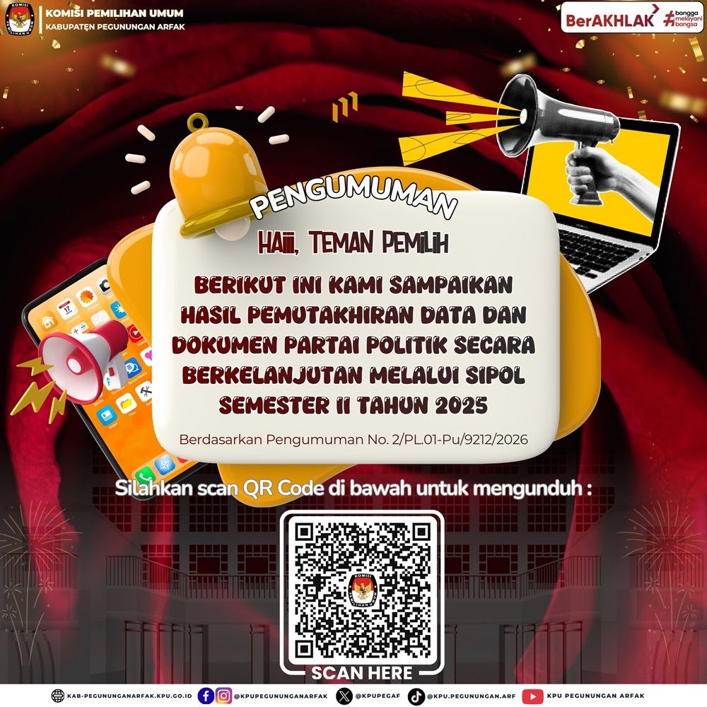 #TemanPemilih — KPU Kabupaten Pegunungan Arfak menyampaikan informasi terkait Hasil Pemutakhiran Data dan Dokumen Partai Politik secara Berkelanjutan melalui Sistem Informasi Partai Politik (SIPOL) untuk periode Semester II Tahun 2025.
