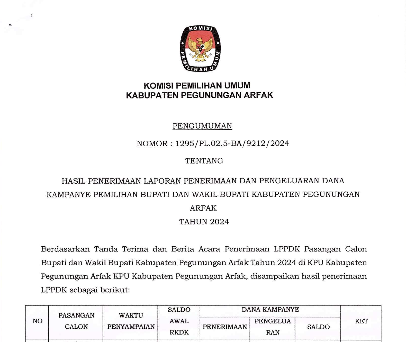 #temanpemilih, berikut kami sampaikan Pengumuman Hasil Penerimaan LPPDK (Lap. Penerimaan dan Pengeluaran Dana Kampanye) & LPPDK Perbaikan Peserta Pemilihan Bupati dan Wakil Bupati Pegunungan Arfak Tahun 2024.