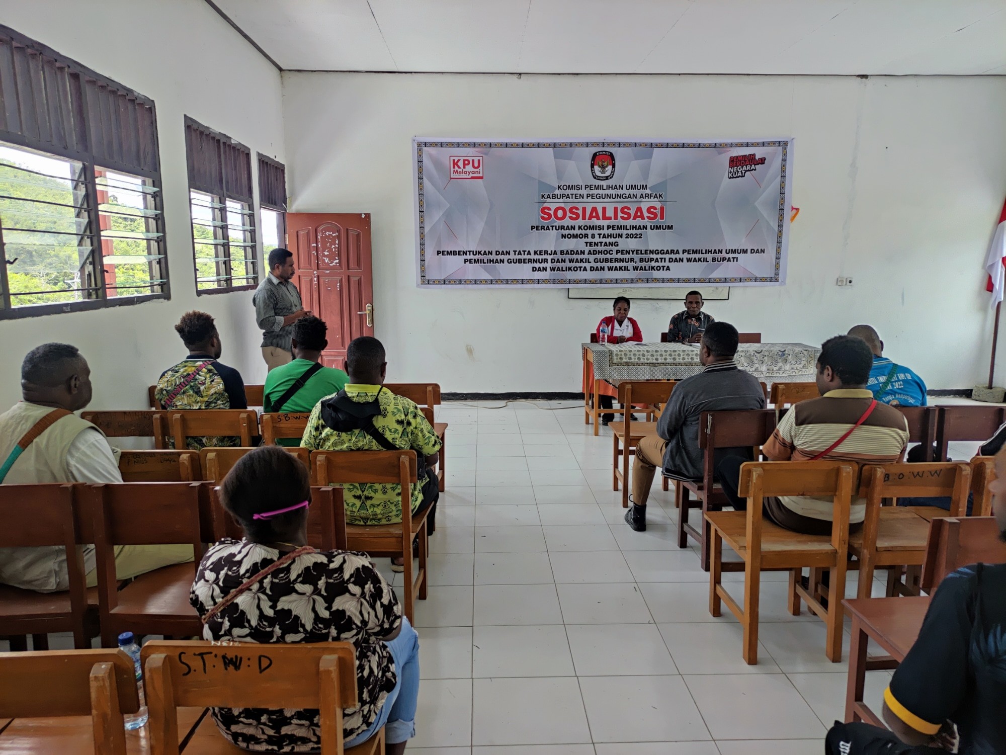 Repost JDIH KPU Pegunungan Arfak Hai #SobatJDIH KPU Kabupaten Pegunungan Arfak melakukan Sosialisasi Peraturan KPU Nomor 8 Tahun 2022 tentang Pembentukan dan Tata Kerja Badan ADHOC penyelenggara Pemilihan Umum dan Pemilihan Gubernur dan Wakil Gubernur, Bupati dan Wakil Bupati dan Walikota dan Wakil WaliKota di Distrik Anggi pada tanggal 16 November 2022 serta di Distrik Minyambouw pada tanggal 17 November 2022. Kegiatan Sosialisasi dibuka langsung oleh Ketua KPU Kabupaten Pegunungan Arfak Bpk Hery Towansiba didampingi Divisi Sosialisasi, Pendidikan Pemilih dan Partisipasi Masyarakat Bpk Thomas Demih, serta Divisi Hukum dan Pengawasan Bpk Nikolas Saiba dilanjutkan dengan Sosialisasi serta pemaparan Materi terkait Aplikasi SIAKBA (Sistem Informasi Anggota KPU dan Badan ADHOC) oleh Kasubag Hukum dan SDM KPU Kabupaten Pegunungan Arfak Bpk Paris Uria Pedai. Kegiatan ini diikuti oleh Masyarakat yang tersebar di beberapa Distrik yang ada di Wilayah Kabupaten Pegunungan Arfak yang ingin berpartisipasi dalam penyelenggaraan Pemilu lewat seleksi Calon Panitia Pemilihan Distrik (PPD).